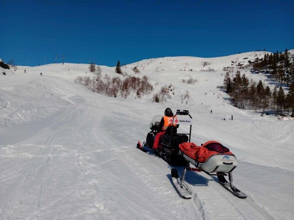 Røde Kors kan gjøre det i forbindelse med avtalt områdebefaring/øvelser etter søknad og i forbindelse med leteaksjoner eller henteoppdrag - etter rekvirering fra Politi, lege, legevakt eller AMK.Vi kan altså ikke på eget initiativ kjøre ut i terrenget/skiløypa å hente noen som har ringt oss.